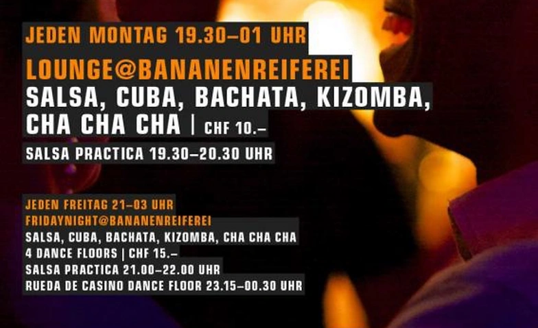 Salsa, Bachata, Cha-Cha-Cha, Son - das sind die richtigen Rhythmen, für einen schwungvollen Start in eine neue Woche. Komm am Montag zum Salsa-Tanzabend der SalsaRica in die Bananenreiferei. Bis 01.00 Uhr in die Nacht könnt ihr voller Freude das Tanzbein schwingen.
