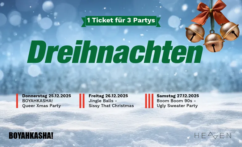 Weihnachten wird dieses Jahr in Zürich neu definiert, denn das Party-Label Boyahkasha! und das Heaven bündeln ihre Kräfte für ein dreitägiges Spektakel: "Dreihnachten". Wer dem familiären Pflichtprogramm für ein paar Nächte entfliehen möchte, findet hier die perfekte Gelegenheit, die Feiertage durchzutanzen – und das mit nur einem Kombiticket.