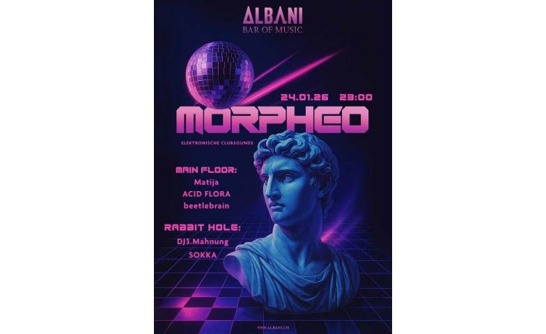 Morpheus ruft! – Wer wagt, tritt ein. Das Albani verwandelt sich in eine surreale Traumlandschaft: Marmorene Statuen flüstern alte Geheimnisse, kitschige Sonnenuntergänge glühen bis zum Morgengrauen. Jeder Beat ist ein Versprechen.
