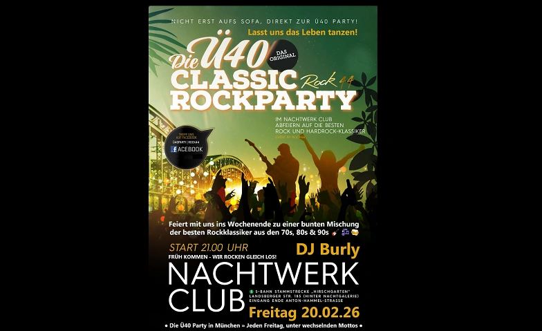 ► Location: Ü40-Party von Rock44 im Nachtwerk Club München, Landsberger Str. 185, 80687 München 📌