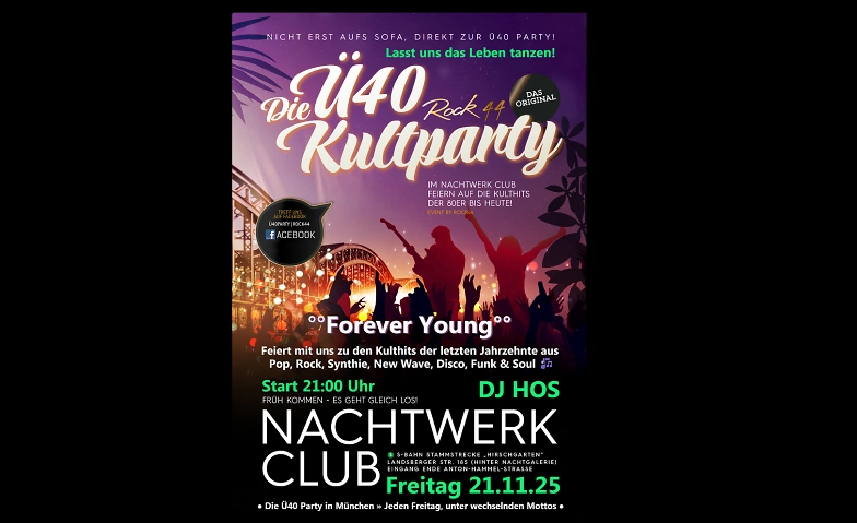Rock44 ➤ °°FOREVER YOUNG°° » Die große Ü40 Kultparty im Nachtwerk Club mit DJ HOS & einer bunten Mischung der Kulthits der letzten Jahrzehnte aus Pop, Rock, Synthie, New Wave, Disco, Funk & Soul 💃🕺🤸🍹🍻