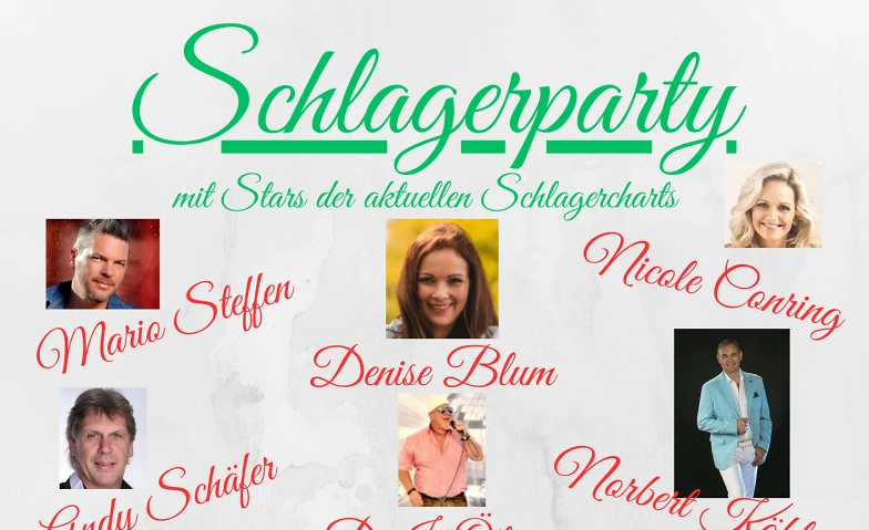 Freut euch auf eine unvergessliche Nacht voller Musik, Spaß und guter Laune! Bei unserer Schlagerparty erwarten euch 5 bekannte Live-Künstler (Nicole Conring, Norbert Köhler, Denise Blum, Andy Schäfer und Mario Steffen), die aus Funk und Fernsehen bekannt sind, sowie ein DJ Ötzi Double, das für die perfekte Partystimmung sorgt.