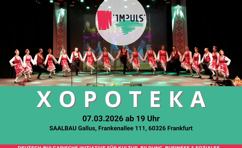 Am 07 März 2026 erwarten wir Sie im Saalbau Gallus für einen unvergesslichen Abend voller traditioneller bulgarischen Rhythmen und Überraschungen. Wir haben uns um einen tollen Saal zum Tanzen bis zum Morgengrauen und ein Musikprogramm gekümmert. Unsere besonderen Gastchoreografen werden dafür sorgen, dass wir neue Tänze lernen.