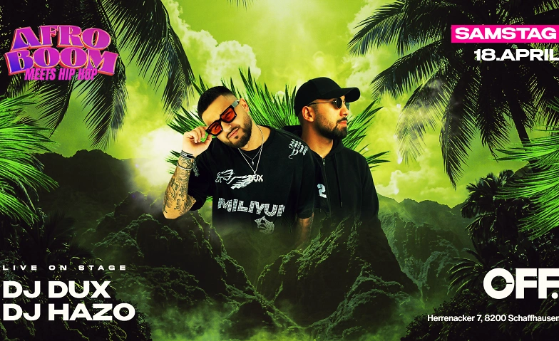 Nach einem sehr erfolgreichen Debüt zieht das erfolgreiche Label Afro-Boom mit seinem unverwechselbaren Afro-Sound am Samstag, 18. April 2026, zum zweiten Mal bei uns in den „OFF.“ Pop-up-Club im ehemaligen Swiss Casinos am Herrenacker 7 in Schaffhausen ein. Freut euch auf eine Nacht voller Afrobeats, Hip-Hop, Amapiano und pulsierender Club-Vibes, die die Tanzfläche zum Beben bringen werden! Mit dabei sind die DJs Dux und Hazo, die euch mit ihrer Energie durch die Nacht führen. Kommt früh, bleibt lange – es wird boomen!