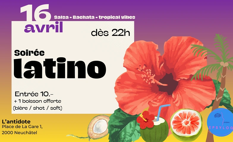 L’association étudiante EPSYLOG de Neuchâtel t’invite à une soirée latino inoubliable au Bar Lounge L’Antidote, idéalement situé en plein cœur de la gare de Neuchâtel !