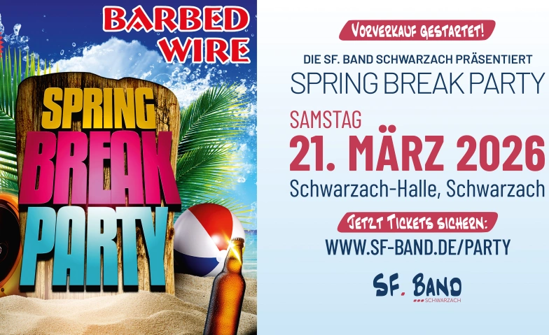 die Zeit der Vorfreude ist vorbei, denn der Vorverkauf für unser spektakuläres Event, die SPRING BREAK PARTY VOL. IV, ist jetzt offiziell gestartet! Sichert euch eure Plätze für einen unvergesslichen Abend mit der Showband Barbed Wire am Samstag, den 21. März 2026, in der Schwarzach-Halle.