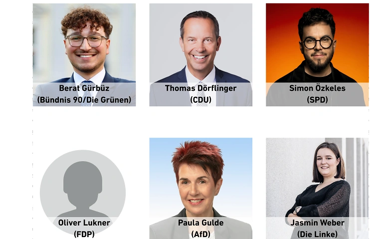 Credits: Berat Gürbüz (B90/Grüne; Foto von Joshua Meisel), Thomas Dörflinger (CDU; Foto von privat), Simon Özkeles (SPD; Foto von SPD-Landesverband BW), Oliver Lukner (FDP; Foto von FDP Landesverband BW), Paula Gulde (AfD; Foto von privat), Jasmin Weber (Die Linke