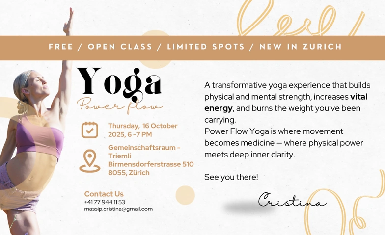 🌟 I'm Cristina, and I just arrived in Zürich with a transformative yoga practice you haven't experienced before. Power Flow Yoga is a dynamic practice that doesn't just strengthen your body – it transforms your energy, releases trapped emotions, and reconnects you with your personal power.