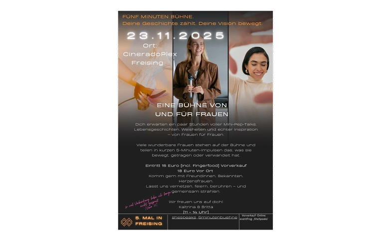 Am 23.11.2025 laden wir dich ins CineradoPlex Freising ein zu einem inspirierenden Vormittag von Frauen für Frauen. Mehrere besondere Frauen teilen in kurzen 5-Minuten-Impulsen ihre Erfahrungen, Lebensgeschichten, Weisheiten und Visionen – ehrlich, berührend und stärkend.