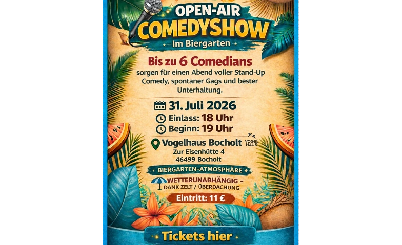 Comedyshow Biergarten Open-Air im Vogelhaus Bocholt Veranstaltungslokal Vogelhaus, Zur Eisenhütte 4, 46399 Bocholt Tickets
