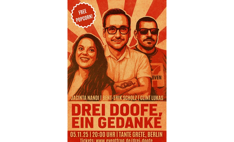 Berlin bekommt eine neue Lesebühne, die die altbekannte Dynamik aufrüttelt. Drei gestandene Textkünstler:innen kommen zusammen, um sich gegenseitig zu Hochleistungen anzustacheln. Jacinta Nandi, mit "Single Mom Supper Club" auf der Longlist des Deutschen Buchpreises 2025; Clint Lukas, Berlins wohl umtriebigster Underground-Autor und Kolumnist der Berliner Zeitung; und Bent-Erik Scholz, Podcaster, Blogger, und Lesebühnenautor – dieses Lineup verspricht Punk, neue Perspektiven, und einen frischen Wind für die Szene. Im Keller bei Tante Grete kommt bildgewaltiges Kopfkino auf euch zu. Passend dazu gibt es für Besucher kostenloses Popcorn!