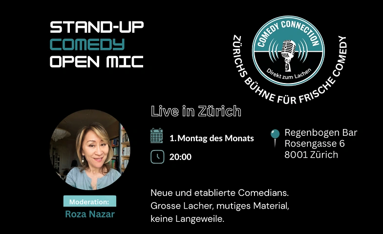 Comedy Connection bringt eine frische Open Mic Stand-up Comedy Show in die Regenbogen Bar Zürich. Freu dich auf einen abwechslungsreichen Abend mit Newcomern und etablierten Comedians, die neues Material testen, spontane Momente kreieren und ihre besten Punchlines präsentieren.