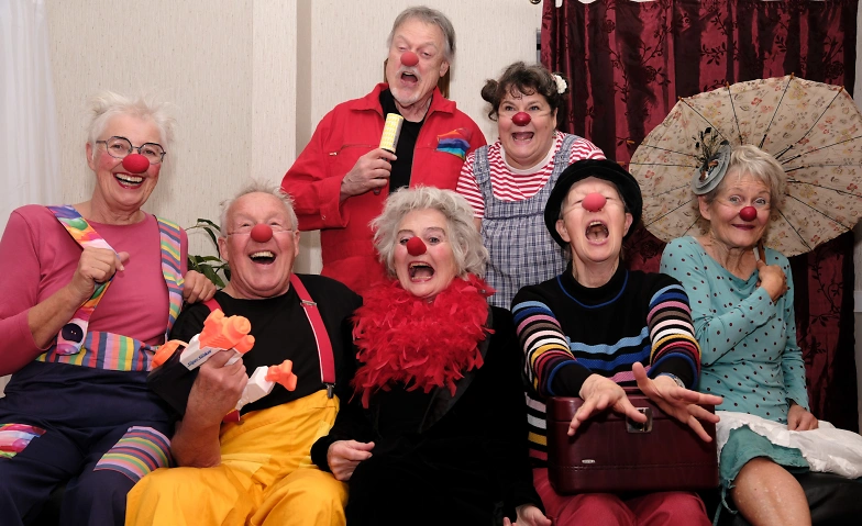 Die neun begeisterten Clown-Spieler*innen sind allesamt Absolventinnen und Absolventen der Clown 50plus Kurse des TuT, der Schule für Tanz, Clown und Theater in Hannover. Inzwischen hat das Ensemble das nächste Spiellevel erreicht und präsentiert voller Energie und guter Laune seine neueste Produktion "Protzen. Scheitern. Jubilieren. ... immer wieder!", eine abendfüllende Clowntheaterrevue.