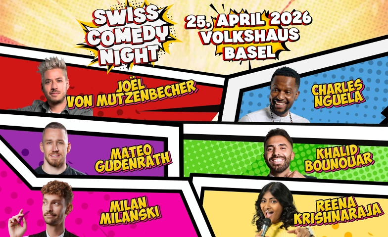 Basels eigene Comedyfrisur Joël von Mutzenbecher hostet am 25. April 2026 mit Charles Nguela, Khalid Bounouar, Reena Krishnaraja, Mateo Gudenrath und Milan Milanski fünf der momentan angesagtesten Comedians für eine ultimative Mixed Show, die es so nur ein Mal geben wird.