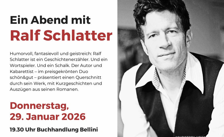 Ralf Schlatter ist ein Geschichtenerzähler. Und ein Wortspieler. Und ein Schalk. Der Autor und Kabarettist – im preisgekrönten Duo schön&gut – präsentiert einen Querschnitt durch sein Werk, mit Kurzgeschichten und Auszügen aus seinen Romanen. All seinen Texten eigen ist eine Mischung aus feiner Beobachtung, rhythmischer Sprache, blühender Fantasie, tragikomischen Figuren und geistreichem Humor. Und als gestandener Bühnenmensch ist es ein Vergnügen, ihm zuzuhören.