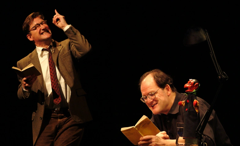 Auf der Bühne: Herr Quast, Meister der multiplen Rollengestaltung (allein im Osterspaziergang: 19 Rollen), und Herr Mosetter, Meister der Fußnote – gemeinsam kämpfen sie sich durch Faust I unter Hinzuziehung von Psychoanalyse, Quantentheorie und der Kunst, Papierflieger zu falten.