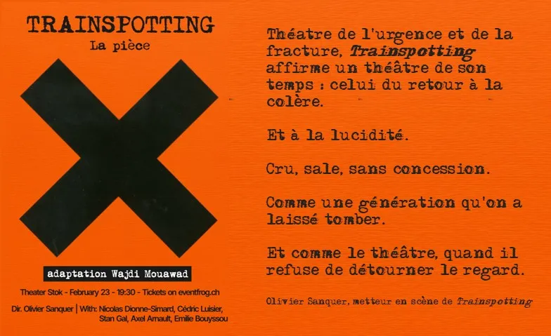“Trainspotting” est l’adaptation théâtrale du roman à succès de l’auteur écossais Irvine Welsh, également transposé au cinéma à la fin des années 90. Mark Renton erre avec ses amis dans les quartiers pauvres de leur ville natale. Il raconte la déchéance dans laquelle ses amis d’enfance et lui se sont enlisés. Révoltés, désabusés, refusant d’entrer dans le moule que la société voudrait leur imposer, ils ont trouvé refuge dans l’univers de la drogue, croyant rendre leur existence plus supportable.