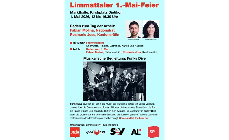 • 14 Uhr: Reden zum 1. Mai (Fabian Molina, Nationalrat ZH, Rosmarie Joss, Kantonsrätin)