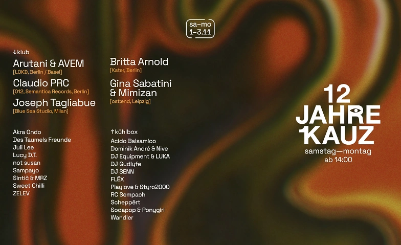 Search Filters Events in which will take place Today Tomorrow in . Reset filters This weekend: House & Techno Party in Bassersdorf Register your event Oct 31 12 Jahre Kauz // Freitag 31 October, Friday, 22:00 Kauz, Zürich (CH) Oct 31 Tardeo am Platz – Halloween Edition 31 October, Friday, 22:00 Padel Club Switzerland, Rümlang (CH) Nov 1 12 Jahre Kauz // Samstag - Montag 01 November, Saturday, 14:00 – 03 November, Monday, 01:00 Kauz, Zürich (CH) Missing your event? Register your event with just a few clicks here and benefit from additional marketing opportunities. Create event
