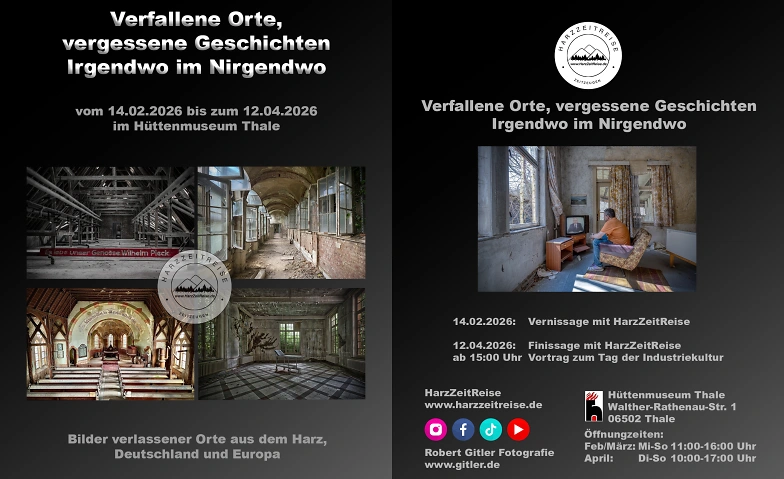 Thale - Die Fotoausstellung "Verfallene Orte, vergessene Geschichten - Irgendwo im Nirgendwo" von HarzZeitReise, einem Projekt des Fotografenduos Stefanie und Robert G. aus Thale im Harz, öffnet am 14. Februar 2026 ihre Türen. Die imposanten Bilder, die den Zuschauer auf eine Zeitreise mitnehmen, sind bis zum 12. April 2026 im traditionsreichen Hüttenmuseum Thale zu sehen.
