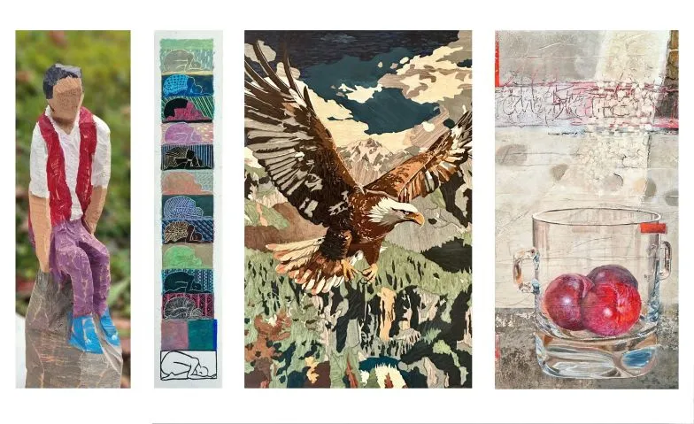 Holzskulpturen-Tier und Mensch mitten aus dem Leben-von Urs Busslinger. Die Holzbeschaffenheit bestimmt den Bearbeitungsvorgang mit der Kettensäge. Die Werke sind mal fein, mal grob ausgearbeitet, teilweise coloriert. Ba Weber geht in ihren Bildern der Frage "Was ist der Mensch?" nach. Es ist eine Auseinandersetzung mit Form und Farbe in verschiedenen Techniken. Ihr geht es nicht um die Antworten, sondern allein darum, dieser Frage nachzuspüren. Furnierbilder von Pascal Senn, einem ehemaligen Schreiner, mit grosser Begeisterung und Präzision gestaltet. Er möchte Menschen für die Schönheit und den einzigartigen, lebhaften Charakter von Holz begeistern. Filigranes, Durchscheinendes auf grob strukturell aufgebauter Leinwand von Sibylle Bolliger. Das Malen von Glasgegenständen und lichtbrechenden Körpern, die das ganze Farbspektrum aufzeigen, übt eine grosse Faszination auf sie aus.