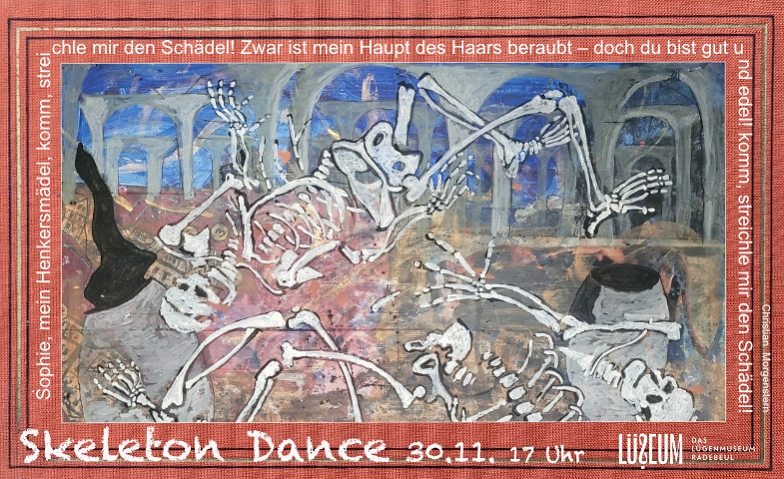 Das Lügenmuseum ist ein Ort der künstlerischen Produktion, der gemeinschaftliche künstlerische Praxis ermöglicht: Künstler/innen verbinden Fine Art, Tanz und Musik nach Totentanz-Motive im Dialog mit Gedichten von Christian Morgenstern in einen kreativen Flow und zu fabelhaften Bildwerken.
