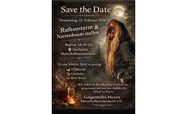 Am 12.02.2026 ab 18:01 Uhr werden das Rathaus gestürmt & der Narrenbaum gestellt.