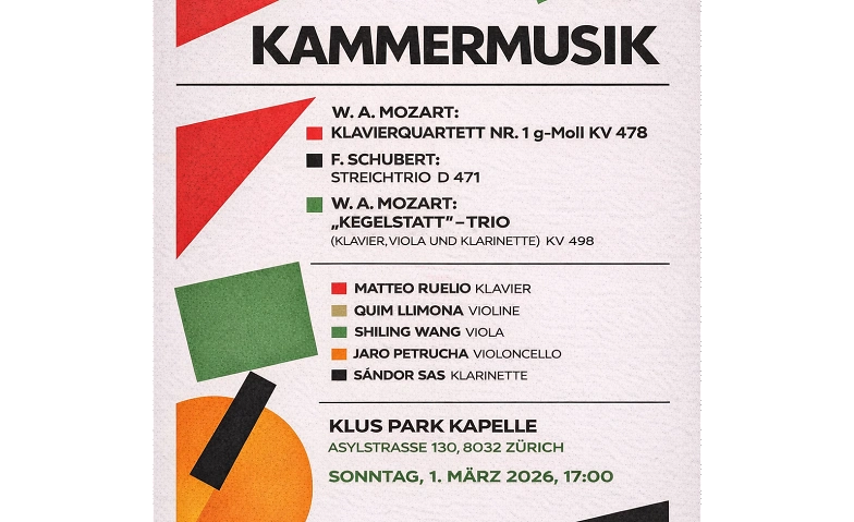 Chamber music concert: Mozart and Schubert Klus Park Kapelle, Asylstrasse 130, 8032 Zürich Tickets