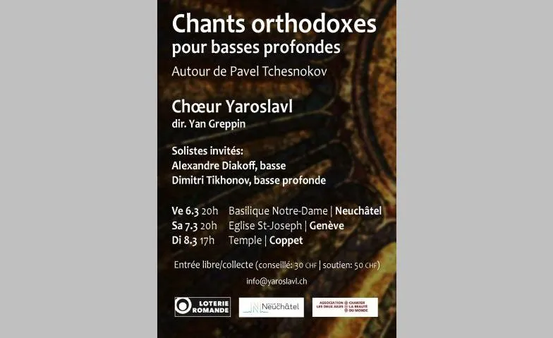 En mars, le chœur Yaroslavl célèbrera le compositeur Pavel Tchesnokov (1877-1944) en accueillant deux basses d'exception, Alexandre Diakoff et Dimitri Tikhonov. Leur timbre unique illuminera ces chants sacrés empreints de spiritualité orthodoxe. Cinq basses profondes complèteront cet ensemble pour un programme inédit explorant l'univers de Tchesnokov et de quelques contemporains, parmi lesquels Kalinnikov et Kastalsky. Entrée libre, collecte (conseillé 30.-) Ensemble: Choeur Yaroslavl Leitung: Yaroslavl : Yan Greppin Solist: Alexandre Diakoff, basse Dimitri Tikhonov, basse profonde
