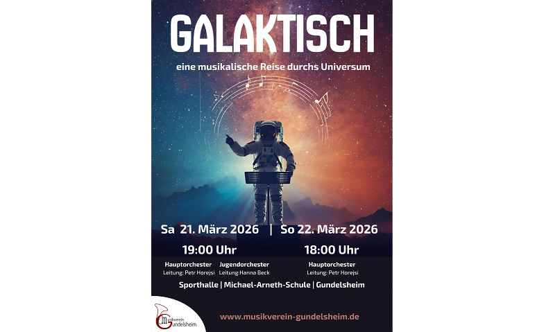 Das Hauptorchester des Musikverein Gundelsheim lädt zu einem Konzertabend ein, der das Publikum auf eine faszinierende musikalische Reise ins Universum mitnimmt. Unter der Leitung von Petr Horejsi entfaltet sich ein abwechslungsreiches und eindrucksvolles Programm, das die Weite des Alls und die Magie ferner Welten in packenden Klangbildern lebendig werden lässt.