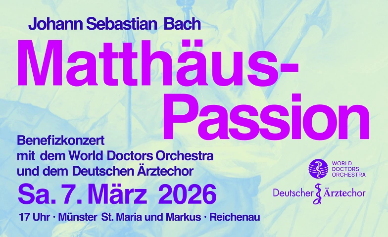 Der Deutsche Ärztechor (DÄC) und das Weltärzteorchester (WDO) führen am 7. März 2026 in der Münsterkirche St. Maria und Markus, Reichenau (Mittelzell), die Matthäuspassion von Johann Sebastian Bach auf.