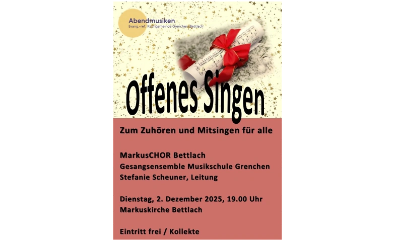 Das traditionelle Offene Singen bringt wie jedes Jahr Advents- und Weihnachtslieder zum Singen und Hören für Gross und Klein. Ausserdem wird in diesem Jahr ein Gesangsensemble der Musikschule Grenchen unter der Leitung von Carola Glaser mitwirken.