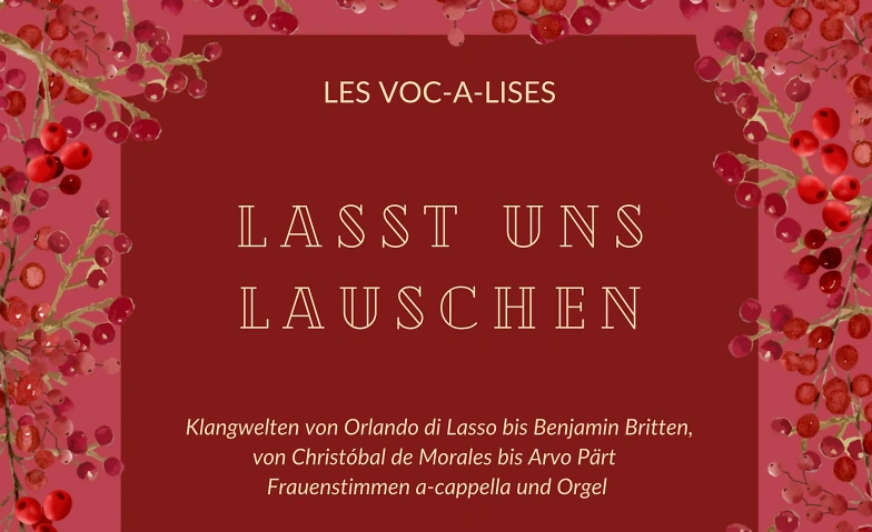 Das Weihnachtsprogramm von "Les Voc-à-Lises" entführt das Publikumin unterschiedliche musikalische Welten, die es zu "erlauschen" gilt. Taucehn Sie ein in die Polyphonie der Renaissance mit Werken von Orlando di Lasso, Christobal de Morales und Tomas Luis de Victoria.