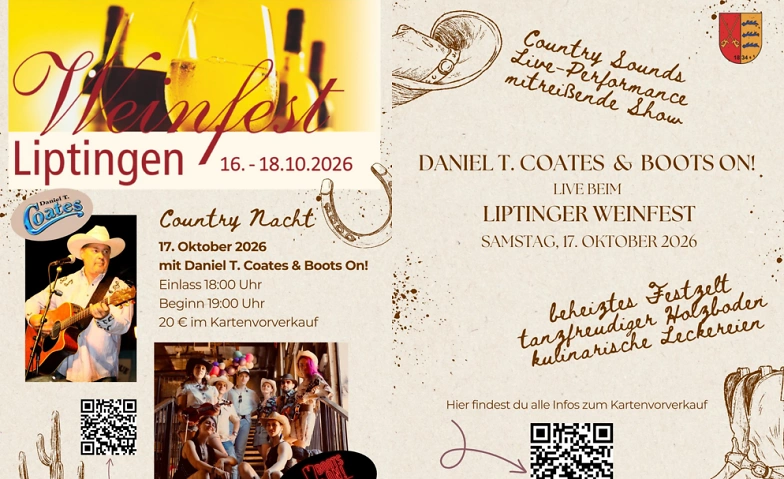 Countrynacht mit Daniel T. Coates und Boots On Weinfest Liptingen, Emmingerstraße 45, 78576 Emmingen-Liptingen Tickets