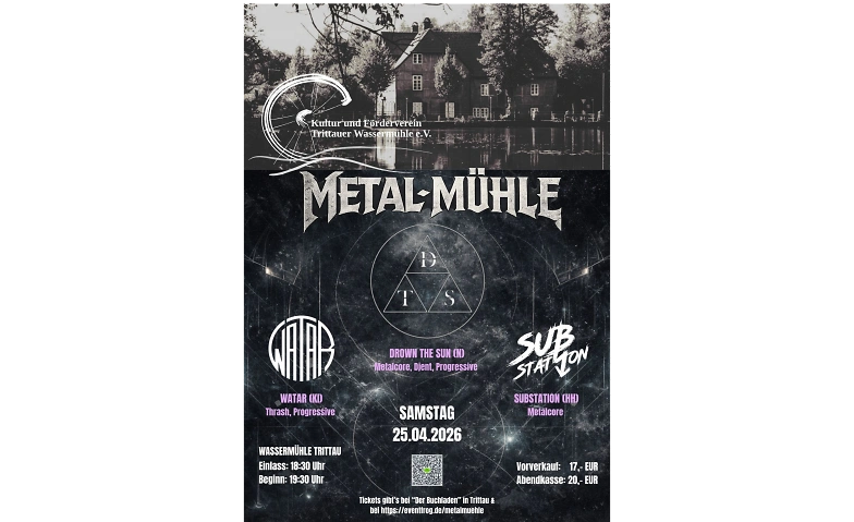 Mit WATAR (Kiel), SUBSTATION (Hamburg) und DROWN THE SUN (Nürnberg) versammelt METAL MÜHLE I drei Bands, die modernen Metal in all seinen Facetten ausloten – technisch versiert, stilistisch eigenständig und mit jener kompromisslosen Energie, die man sonst eher aus den Reviews einschlägiger Metal-Magazine kennt.