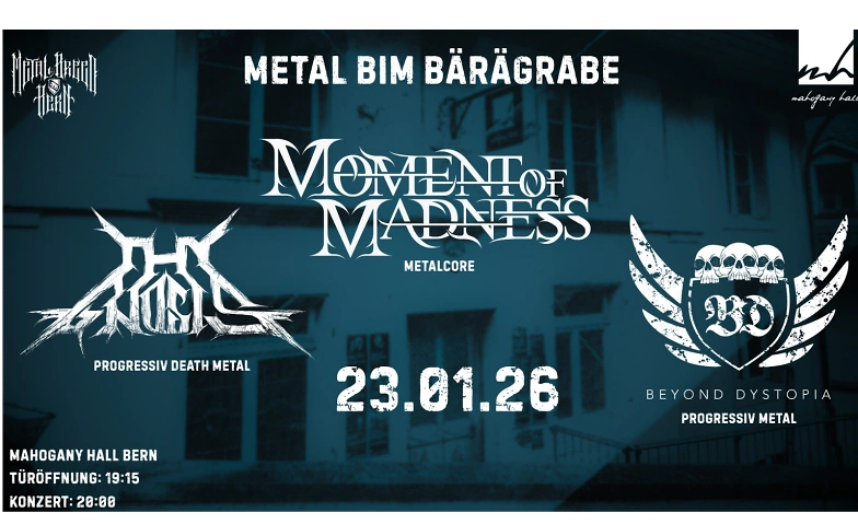 Zum Start des neuen Jahres, laden wir euch zu einem heissen Mix aus harten Riffs, tiefen Emotionen und sphärischer Stimmung zum Headbangen in der Mahogany Hall Bern ein. Als Headliner haben wir mit” Moment of Madnessl” einer der Top CH-Metalcore Bands, welche auch auf dem kommenden LineUp des Greenfield Festivall zu finden ist. Support gibs von unseren Locals “Thy Gnosis” die die Herzen der Deathmetal Fans höher schlagen lässt und Beyond Dystopia die sphärische Stimmung und packenden Groove auf eine musikalische Reise mitreißt.