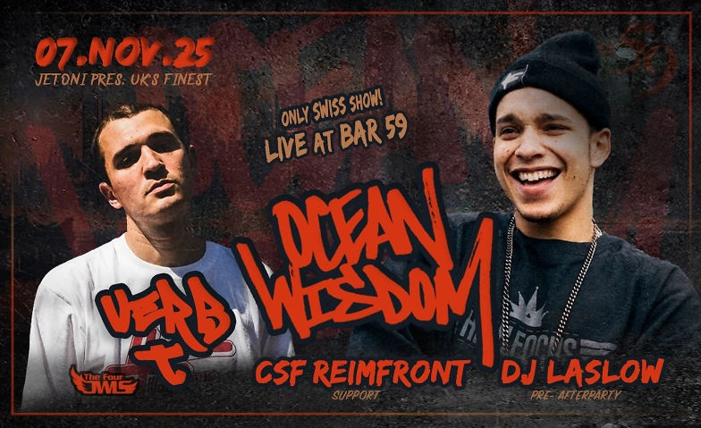 Am Freitag 7. November 2025 erwartet Euch ein UK's finest special und Ocean Wisdom & Verb T kommen nach Luzern. Die britische MC's aus London sind bekannt für ihre rasanten Reime, clevere Wortspiele und energetische Live-Performance. Sichere dir jetzt Tickets für die einzige Schweizer Show und sei dabei, wenn Sie zusammen mit CSF Reimfront die Bühne zum Beben bringen. Freut euch auf ein unvergessliches Konzerterlebnis und Pre- & Afterparty mit DJ Laslow hinter den Decks.