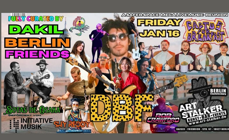 Dakil Berlin Friends ist ein alternatives Indie-Disco-Rock-Kollektiv, das von Dakil geleitet wird. Dakil ist dafür bekannt, seine genreübergreifenden Originalsongs in Momente zu verwandeln, in denen das Publikum zum Teil der Band wird und jede Seele im Raum Teil der Band wird – eine Feier der Musik und Kultur ohne Grenzen. DBF ist eine wechselnde musikalische Familie aus erfahrenen Mitwirkenden. Der Sound lebt von Authentizität, Farbe und Bewegung – optimistisch, echt und auf eine positive Frequenz abgestimmt, auf der die Band und der Raum im gleichen Rhythmus schwingen.