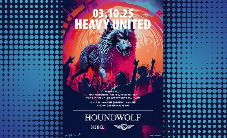 Mit Heavy United steht am 3. Oktober 2025 um 19:30 Uhr in der WERK°STADT ein ganzer Abend im Zeichen von Heavy Metal und Hard Rock bevor. Drei Bands bringen die Bühne zum Beben und liefern harte Riffs, treibende Rhythmen und eine mitreißende Live-Atmosphäre. Freut euch auf die drei Bands: