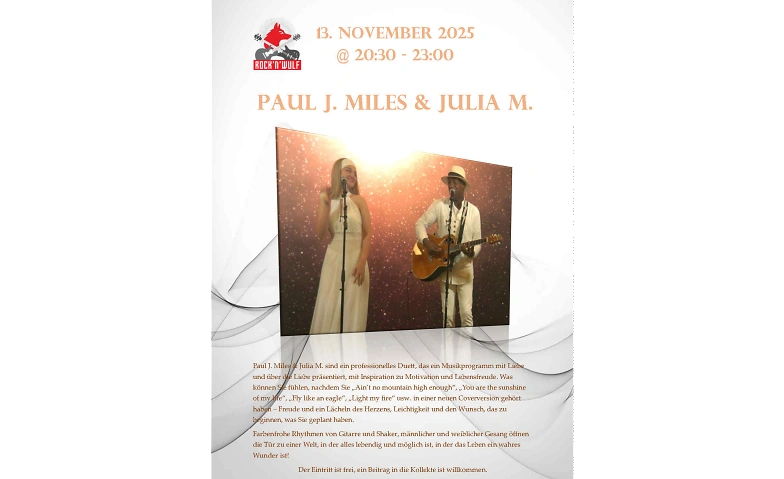 Paul J. Miles & Julia M. sind ein professionelles Duett, das ein Musikprogramm mit Liebe und über die Liebe präsentiert, mit Inspiration zu Motivation und Lebensfreude. Was können Sie fühlen, nachdem Sie „Ain’t no mountain high enough“, „You are the sunshine of my life“, „Fly like an eagle“, „Light my fire“ usw. in einer neuen Coverversion gehört haben – Freude und ein Lächeln des Herzens, Leichtigkeit und den Wunsch, das zu beginnen, was Sie geplant haben.