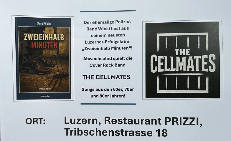 Die spezielle Art Kunst zu geniessen! Der Ehemalige Polizist René Wicki liest aus seinem neusten Luzerner-Erfolgskrimi "Zweieinhalb Minuten" Abwechselnd spielt die Cover Rock Band THE CELLMATES Songs aus den 60er, 70er und 80er Jahren!