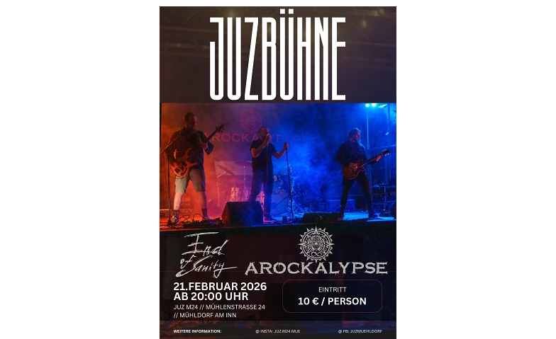 Den Auftakt der Ü16-Konzerte am 21.02.26 machen die regionalen Bands „Arockalypse“ aus dem Landkreis Altötting und „End of Sanity“ aus dem Chiemgau.