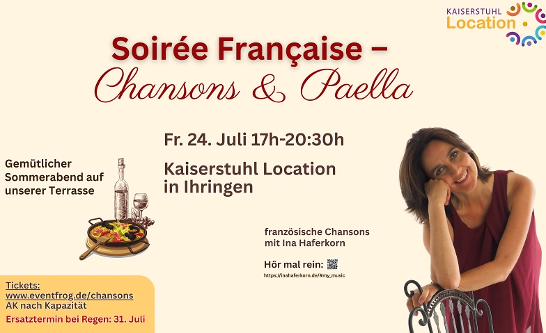 Erleben Sie einen lauen Sommerabend voller französischer Musik, mediterraner Aromen und sommerlichem Flair! Die talentierte Ina Haferkorn, deren Leidenschaft den französischen Chansons gilt, verführt mit zeitlosen Liedern auf Gitarre – romantisch, stimmungsvoll und live. Zwischen den Sets sorgen kleine, feine Häppchen dafür, dass der Hunger kurz gestillt wird – der Fokus bleibt auf Musik und der Vorfreude auf das Hauptgericht: die köstliche Paella.