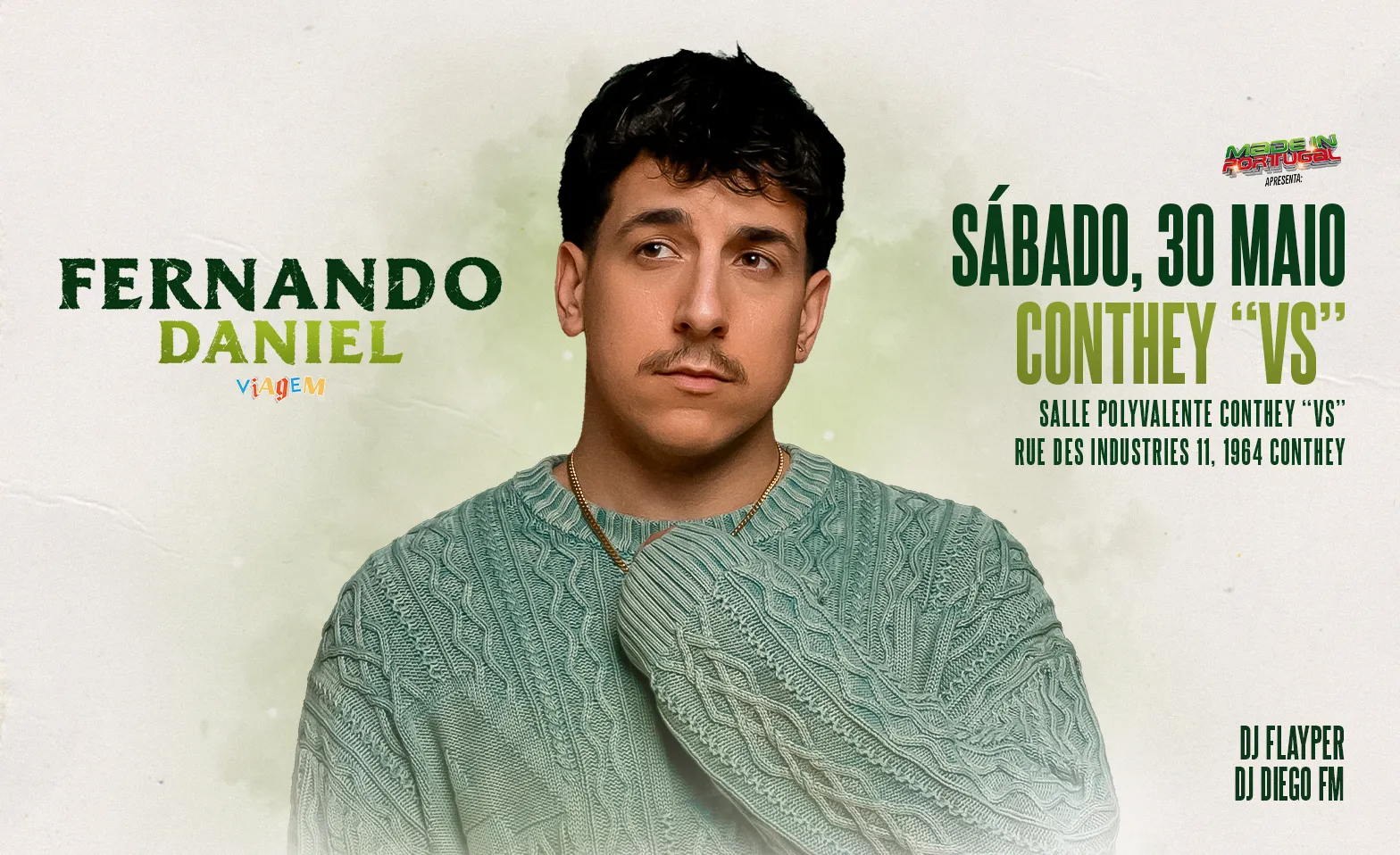 No dia 30 de Maio, na Salle polyvalente de Conthey (Conthey), não percas um espetáculo imperdível com o cantor português multi-platina Fernando Daniel!