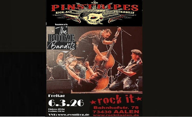 The Pinstripes & The Booze Bandits. Freitag 6.3.26, Rock It Aalen. Kick-Ass Rockabilly, so bezeichnen The Pinstripes ihren Musikstil. Irgendwie treffend, für eine Band die neben eigenen Kompositionen Coverversionen wie z.B. von Jimy Hendrix (Voodoo Chile), AC/DC (Whole Lotta Rosie), Motörhead (Ace of Spades), Chris Rea (Road to Hell), Misfits (Dig up her Bones), Metallica (Nothing Else Matters) im Programm hat, welche in ihrem eigenen „Kick-Ass Rockabilly-Style“ dargebracht werden. Durch zahlreiche Auftritte bei verschiedenen Festivals als auch in kleineren Szene Clubs oder großen Open Air Veranstaltungen, erspielte sich diese Band eine regionale und überregionale Fangemeinde (Summern Breeze, With Full Force, Rock of Ages, Rock am See, Walldorf Weekender, Rockabilly Days).