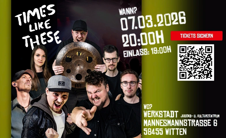 Times Like These (kurz: TLT) bringt die unvergesslichen Rock-Hits der 90er- und 2000er-Jahre mit voller Leidenschaft zurück auf die Bühne. Und am 7. März 2026 um 20:00 Uhr sind sie bei uns in der WERK°STADT. Die Band aus NRW hat sich darauf spezialisiert, die Songs einer Ära wiederaufleben zu lassen, die ein ganzes Lebensgefühl geprägt hat. Mit Klassikern von Linkin Park, Foo Fighters, Red Hot Chili Peppers, Limp Bizkit oder System of a Down liefern TLT nicht einfach nur Cover – sie feiern die Musik, die für viele von uns zum Soundtrack des Lebens geworden ist.