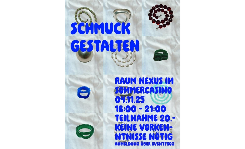 In diesem Workshop lernst du verschiedene Methoden kennen, mit denen du eigene Schmuckstücke gestalten kannst. Der Workshop ist in mehrere Stationen aufgebaut, die allen Teilnehmenden einen einfachen Zugang zur Schmuckgestaltung ermöglichen. Vorkenntnisse sind nicht nötig – nur Freude am Experimentieren und Ausprobieren.