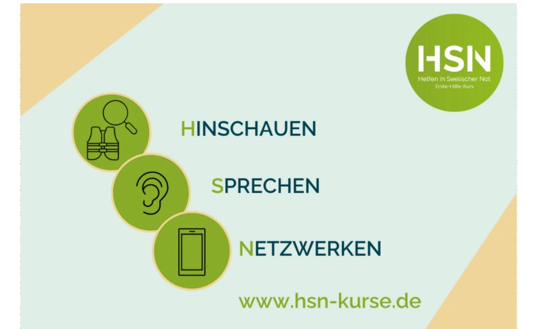 Genau hier setzt der psychische Erste-Hilfe-Kurs von HSN an. In nur zwei Stunden lernen Teilnehmende anhand alltagsnaher Beispiele drei klare Schritte, um Anzeichen seelischer Not und die damit verbundenen Gefühle wahrzunehmen, ein Gespräch zu eröffnen und gezielt weitere Unterstützung zu vermitteln: