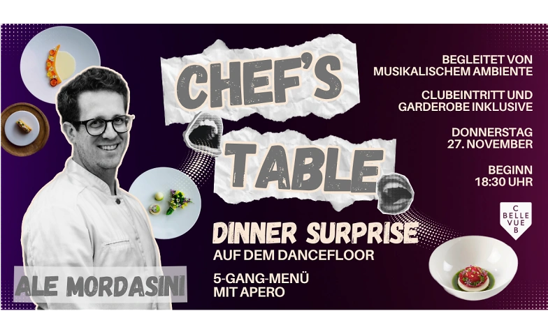 Ein Abend, der Kulinarik, Musik und Nachtkultur verbindet: Am 27. November verwandelt sich der Club Bellevue in einen exklusiven Chef’s Table mit Ale Mordasini und Team. Die Gäste erleben den Küchenchef in intimer Atmosphäre, begleitet von feinen Klängen und einem sorgfältig komponierten 5-Gänge-Menü. Jeder Gang wird live inszeniert – nahbar, persönlich und voller Raffinesse.