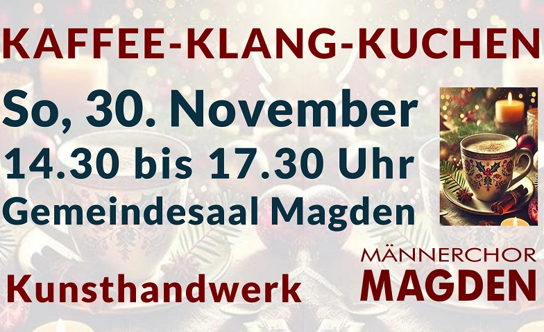 Der Kaffee-Nachmittag findet am Sonntag, 30. November, von 14:30 bis 17:30 Uhr im Gemeindesaal Magden statt.